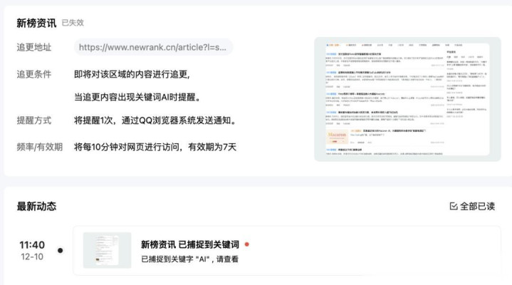不仅能团聚信息,AI订阅助手还能够主动为咱们推送最新资讯,只需输入关节词并确立推送时候和灵验期,AI就能如期按点进行信息推送: