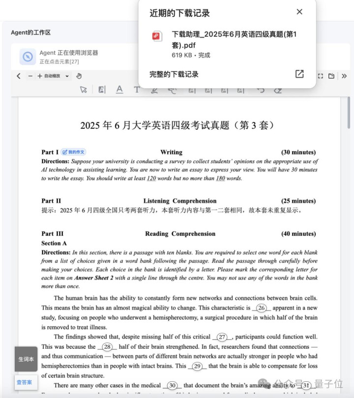 这回我吩咐给AI的任务是,让它帮我全网搜索并下载25年大学英语四级考验真题,约略用时1分钟操纵的时候,AI就帮我在土产货下载好了一份pdf真题文档: