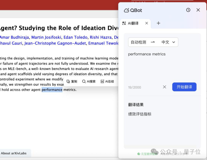 好巧不巧,这个问题QQ浏览器也猜想了,AI+小窗的「网页翻译」不错径直把网页中的英文秒变中语,我唾手拿篇arxiv论文试了试,一键翻全篇,比咱们我方逐句啃单词简陋太多了…